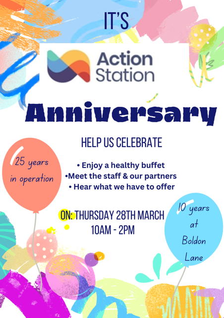 Join us in celebrating 25 years of service at Action Station South Tyneside! For the past decade, we've been proudly located at Boldon Lane. Join us on Thursday, 28th March, from 10 am to 2 pm, for a delightful healthy buffet, the chance to meet our dedicated staff and partners, and to discover the wide array of services we offer. Don't miss out on this special occasion!!