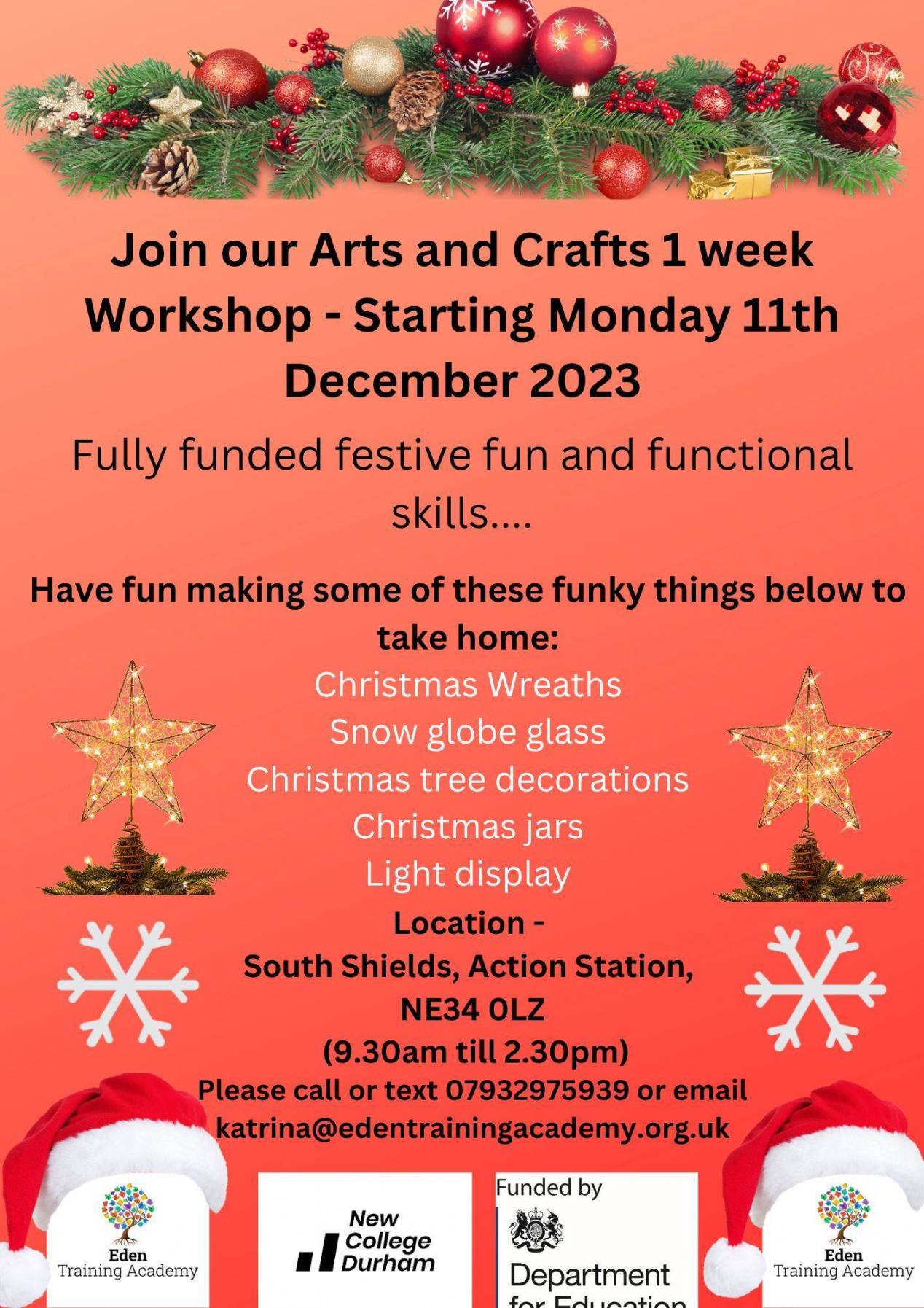 Immerse yourself in a fully funded festive workshop! Explore both fun and functional skills by creating Christmas Wreaths, Snow Globe Glasses, Decorative Tree Ornaments, Christmas Jars, and a captivating Light Display. Unleash your creativity and take home these unique festive creations!